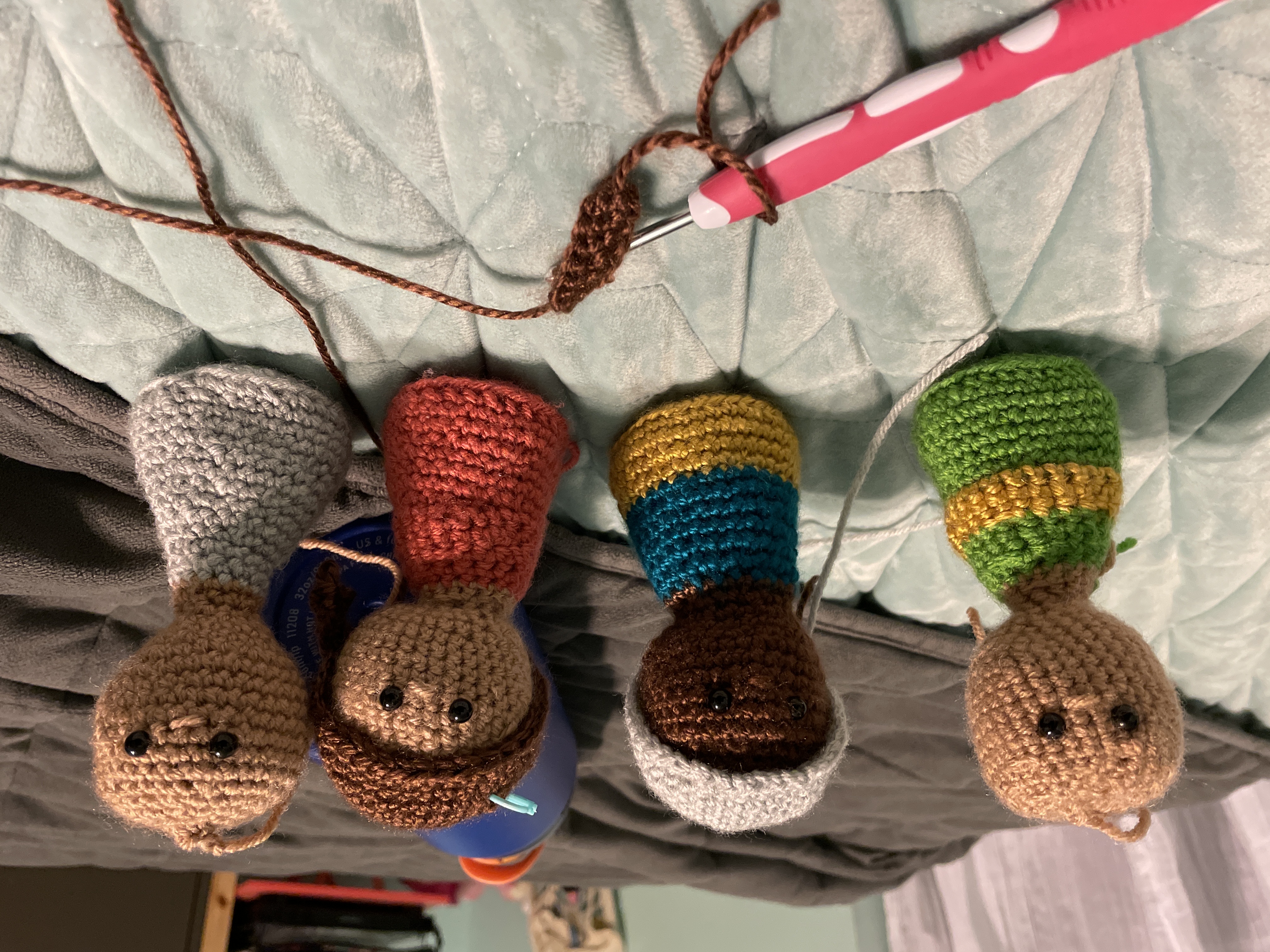 Today I fixed Mary, started her hair and finished the bodies of the others I was working on (2 wisemen and a shepherd). I crocheted one of the above’s hair but not beard and barely started the manger. I also added their eyes and a small nose for each. Tomorrow I’ll finish the remaining pieces before/after the gathering and sew them in place before the evening.